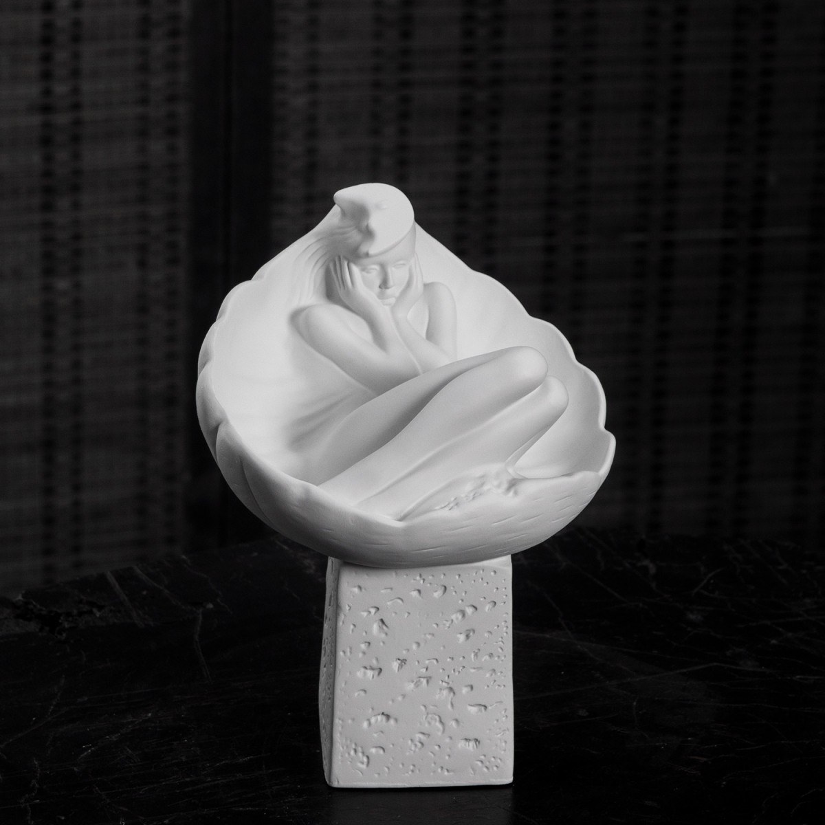 The figure radiates care and calm through its gentle pose. The figure lies in a seashell with her hands up to her face, which reflects vulnerability and mystery.